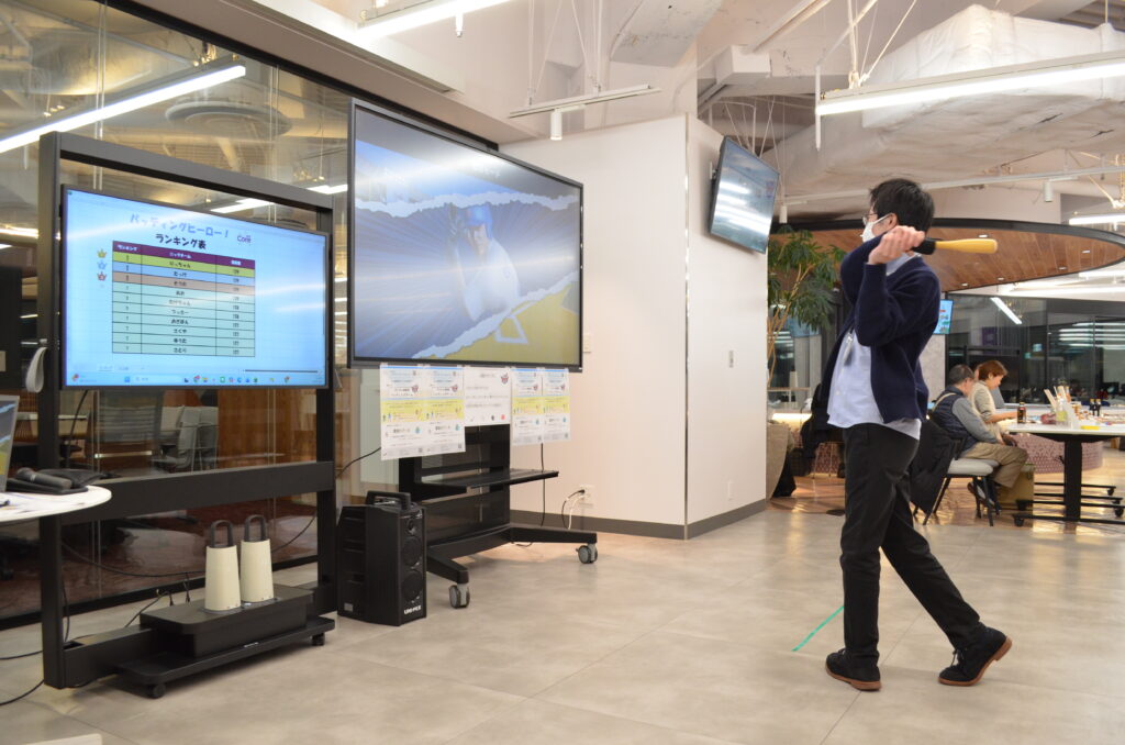 大きな画面に映し出された、バーチャル球場でホームランを狙え!