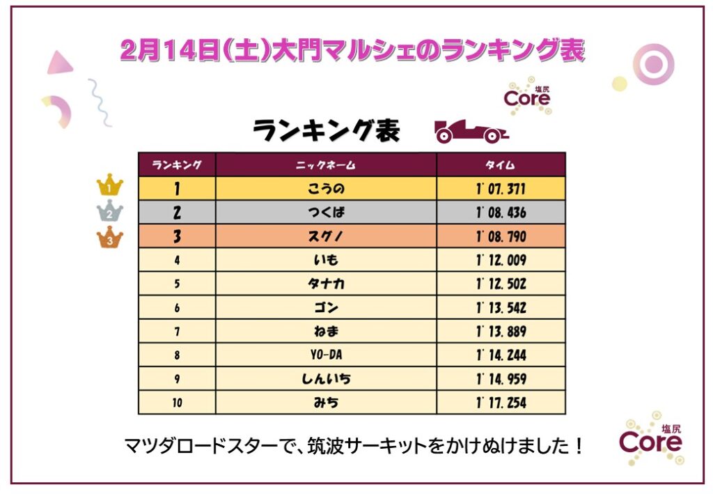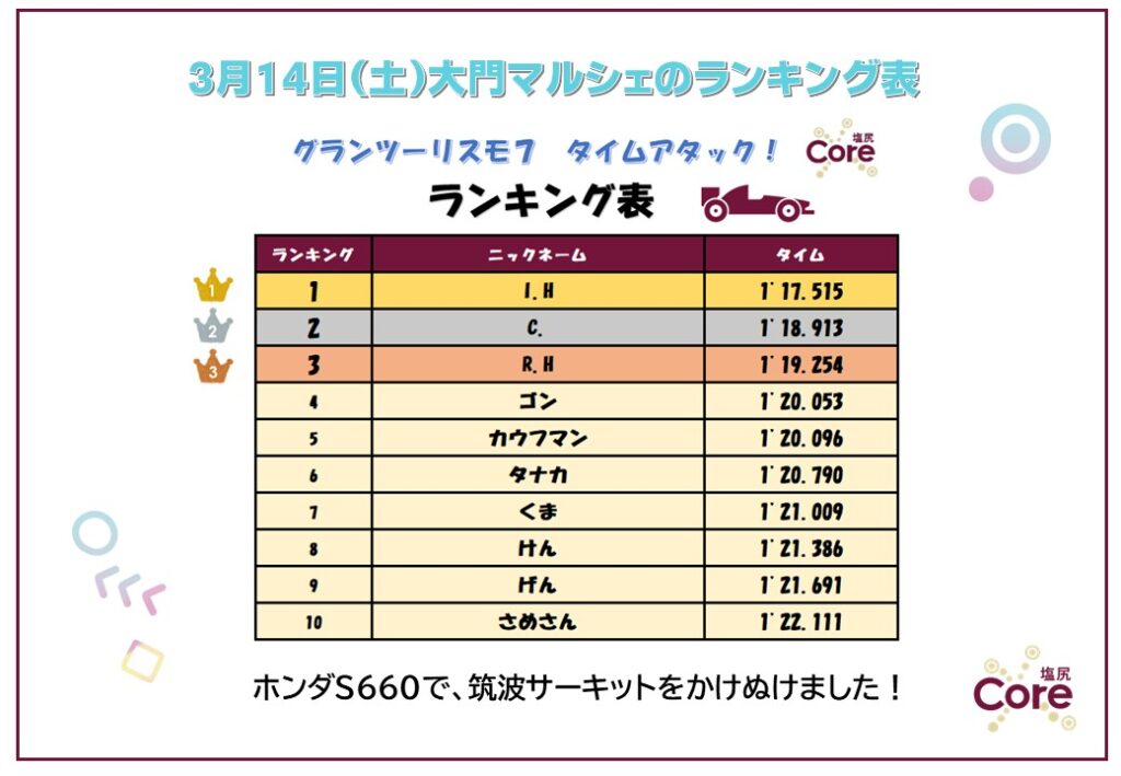 2月14日(土)と3月14日(土)の大門マルシェで「グランツーリスモ7タイムアタック」を開催しました。